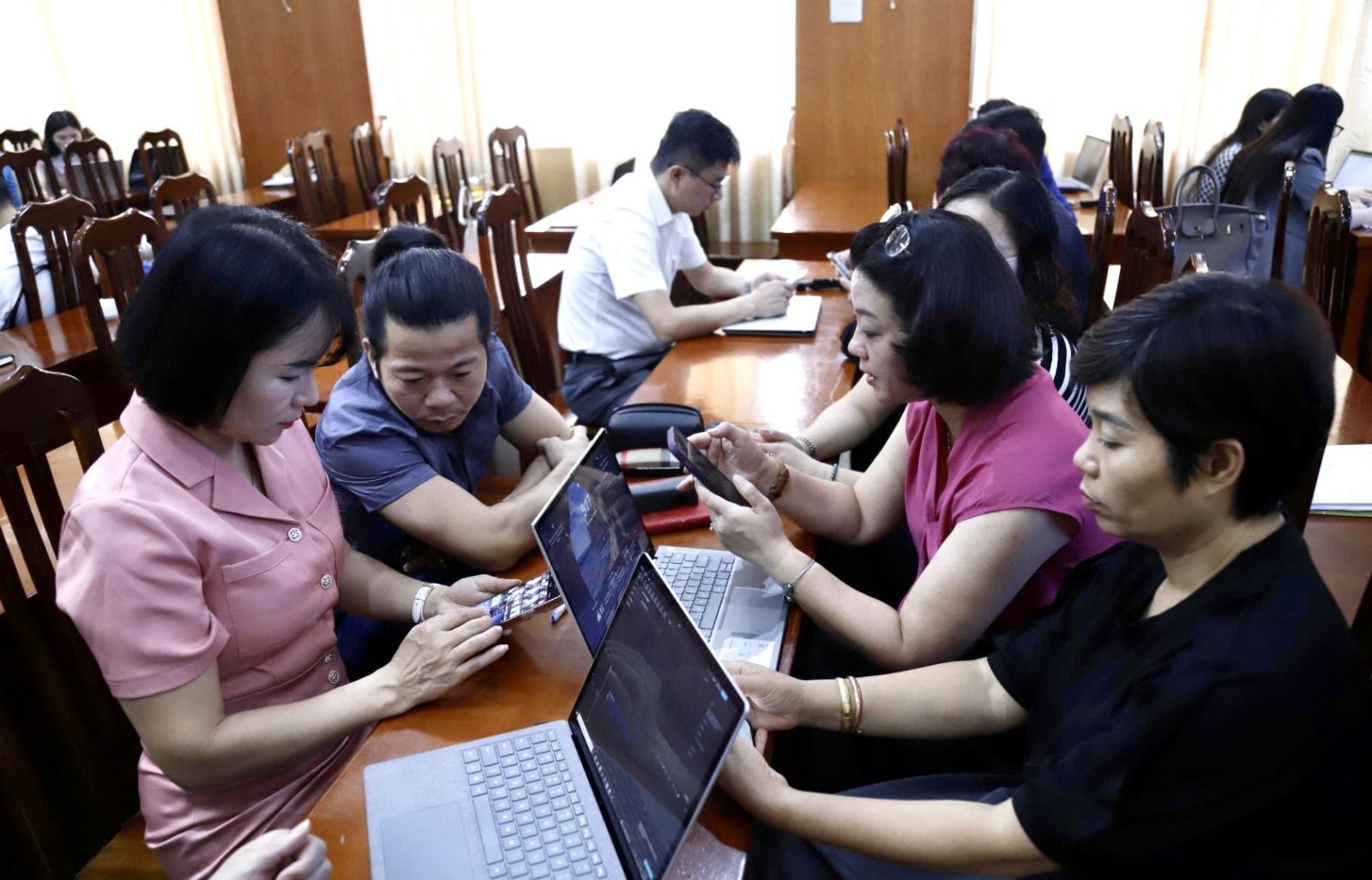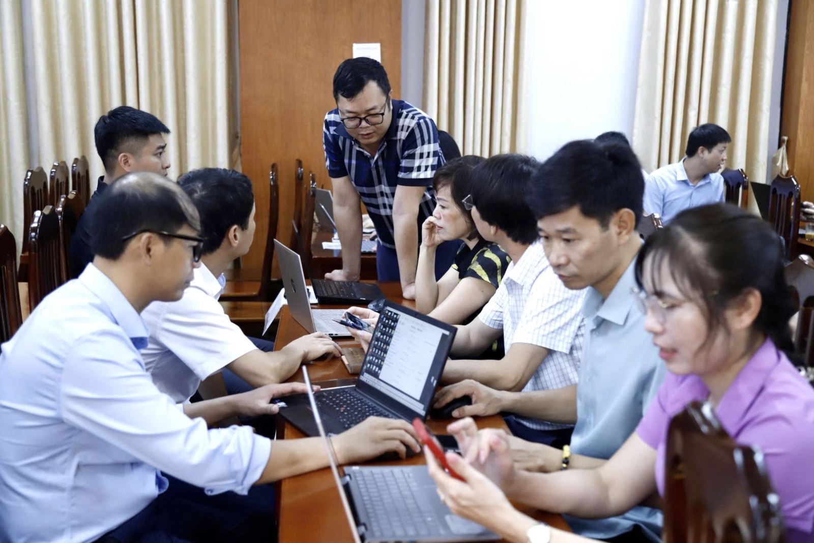 Học viên được chia nhóm, trao đổi, chia sẻ kinh nghiệm và thực hành xây dựng Video clip tuyên truyền