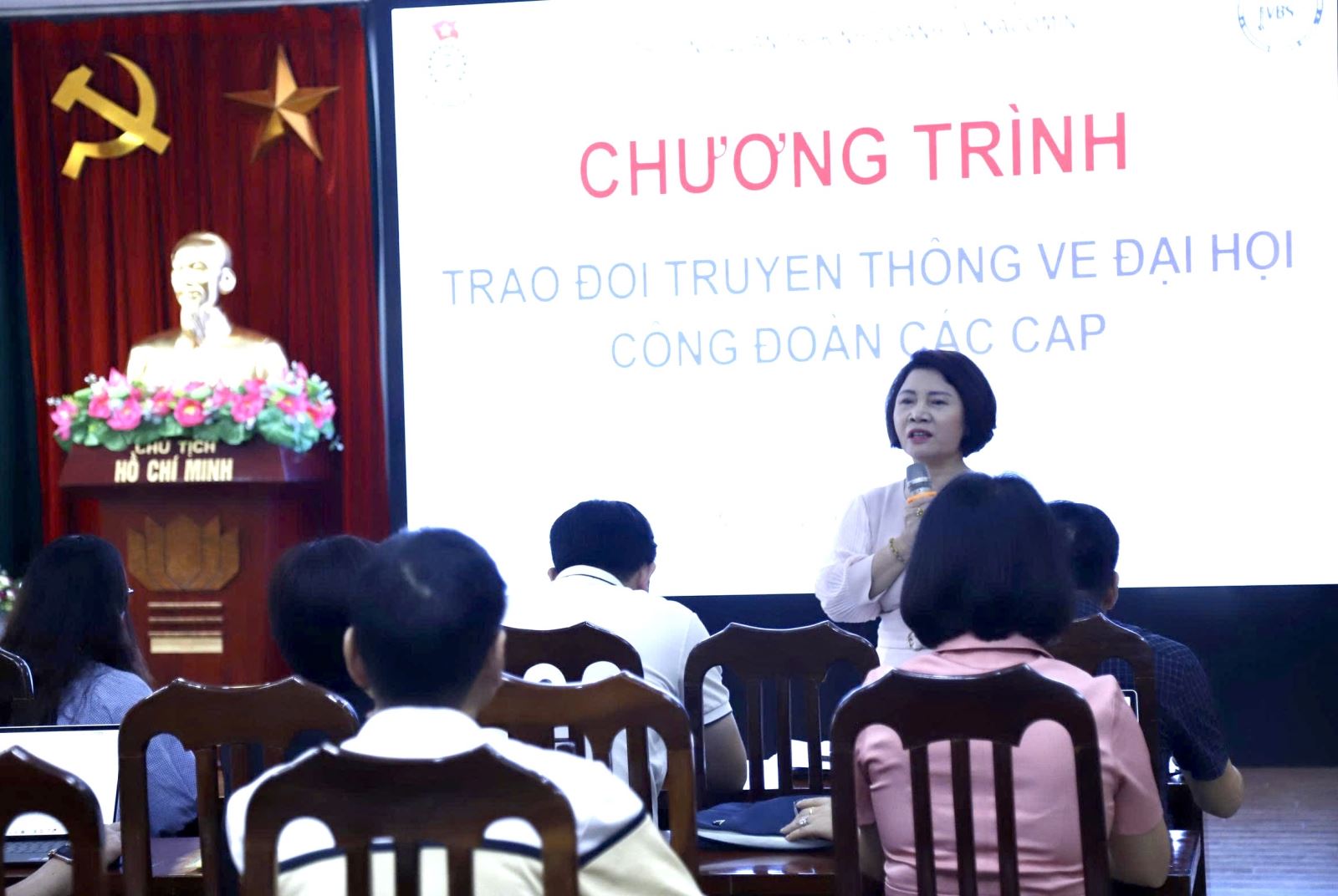 Đồng chí Nguyễn Thị Minh - Phó Chủ tịch Công đoàn TKV trao đổi nội dung tuyên truyền Đại hội công đoàn các cấp