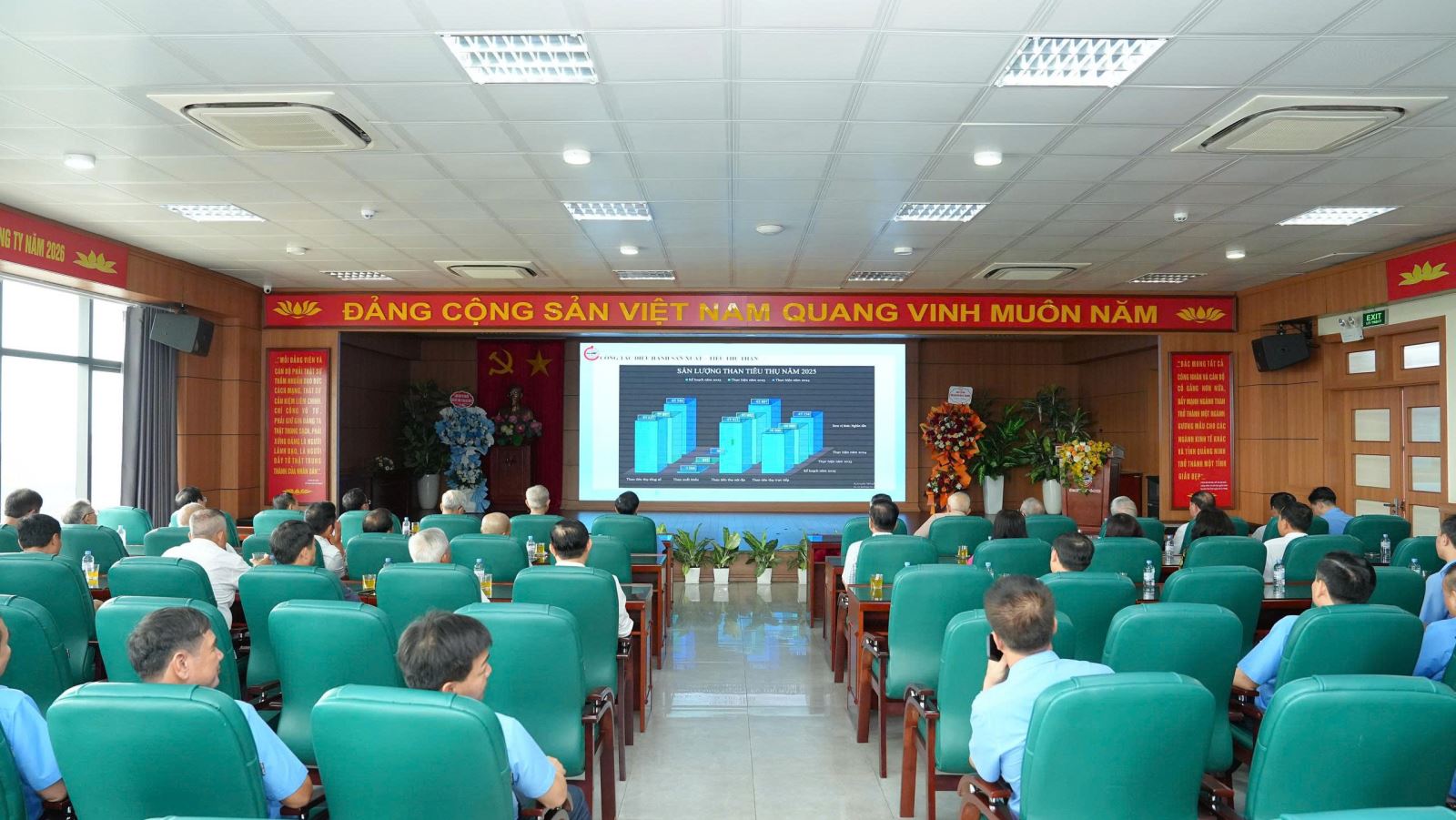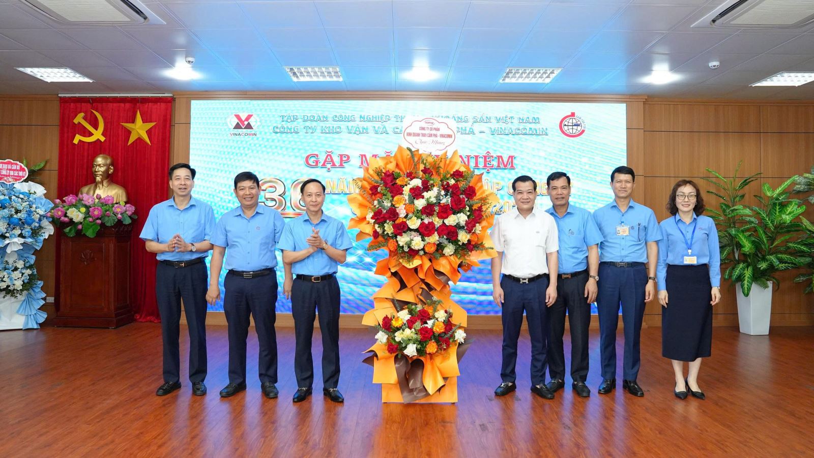 Các thế hệ lãnh đạo, cán bộ chủ chốt Công ty (ảnh trên) và đ/c Đinh Trung Kiên - Bí thư Đảng uỷ, Giám đốc Công ty CP Kinh doanh than CP, nguyên Phó Giám đốc Công ty (ảnh dưới) tặng hoa chúc mừng CBCNV Công ty