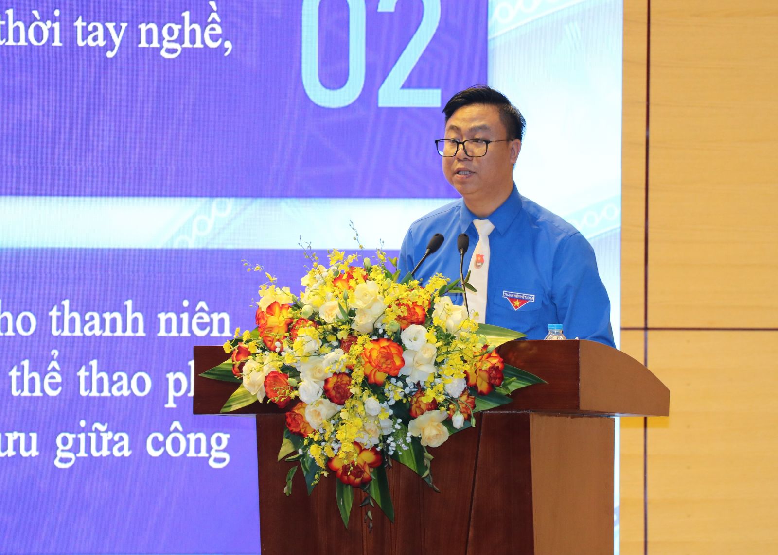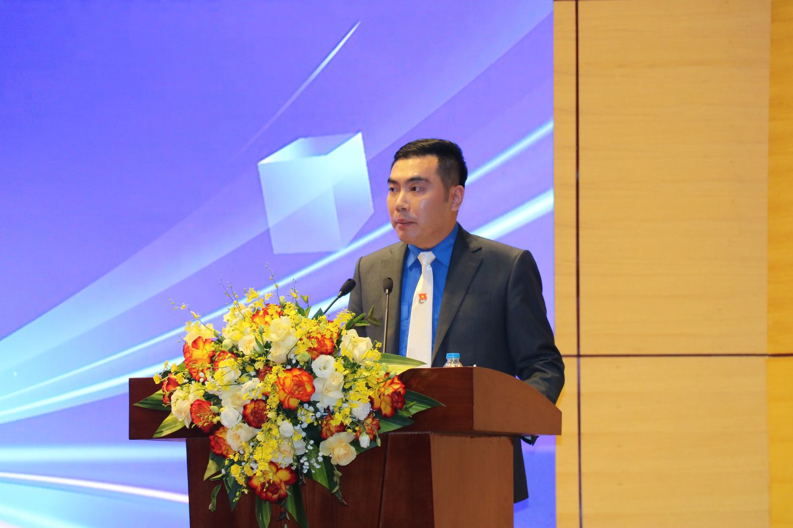 Phó Bí thư Đoàn Thanh niên Than Quảng Ninh Trần Tuấn Đạt trình bày Báo cáo công tác Đoàn và phong trào thanh niên năm 2025 của Đoàn Thanh niên Than Quảng Ninh.