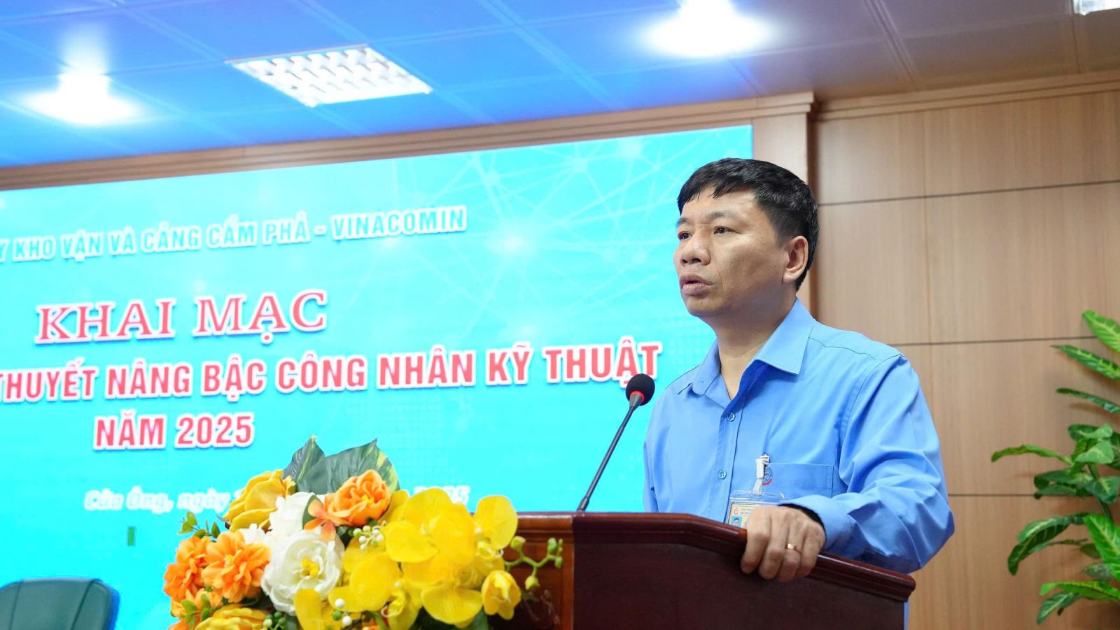 Quang cảnh chương trình khai mạc nội dung thi lý thuyết nâng bậc công nhân kỹ thuật năm 2025 Công ty Kho vận và cảng CP (ảnh trên) và phát biểu chỉ đạo của đ/c Nguyễn Xuân Uyên - Phó giám đốc Công ty tại chương trình (ảnh dưới)