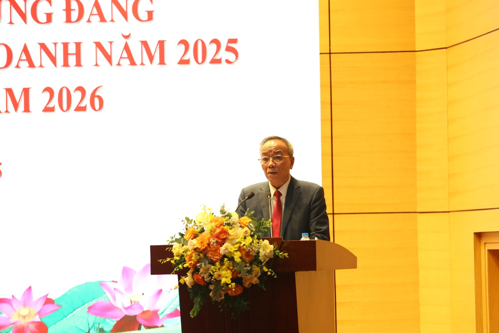 Phó Bí thư Đảng ủy, Tổng giám đốc Tập đoàn Vũ Anh Tuấn trình bày báo cáo tổng kết hoạt động sản xuất kinh doanh năm 2025, triển khai nhiệm vụ năm 2026