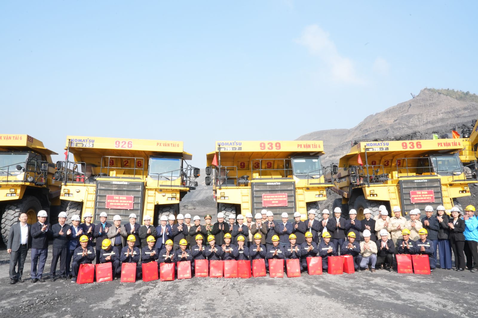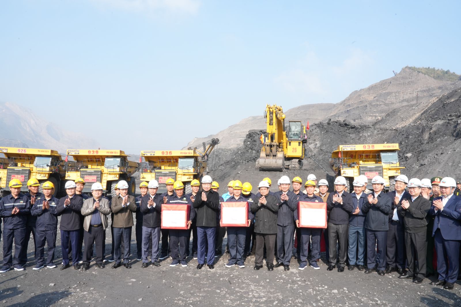 Tổng Bí thư Tô Lâm và Thủ tướng Phạm Minh Chính tặng quà cho công nhân các Tổ máy khoan, Tổ máy xúc PC số 26 và Tổ xe ô tô số 935 tại khai trường sản xuất